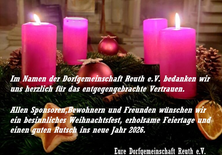 +++ Frohe Weihnachten +++ Beitrags-Autor:Thomas Beitrag veröffentlicht:2025-12-24 Beitrags-Kategorie:Uncategorized Das könnte dir auch gefallen +++ Theateraufführung in Turnhalle Reuth am 24.März 2025 +++ 2025-03-16 Aufruf Reuther Fotos für Kalender 2021-08-19 +++ Nächstes öffentliches Treffen der Dorfgemeinschaft Reuth am Mo. 20.05.2024 19:30 Uhr im Vereinshaus +++ 2024-05-29