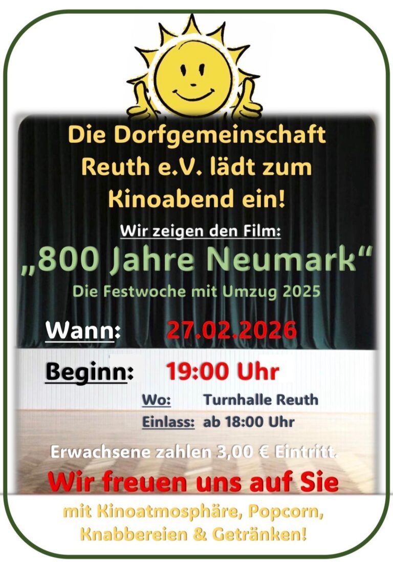 +++ Kinoabend Film: ‚800 Jahre Neumark‘ Fr. 27.2.2026 Beginn 19:00 Uhr, Turnhalle Reuth +++ Beitrags-Autor:Thomas Beitrag veröffentlicht:2026-02-18 Beitrags-Kategorie:Aktuelles aus Reuth / Dorfgemeinschaft Reuth e.V. Schlagwörter: Aktion, Kino Weitere Artikel ansehen Vorheriger Beitrag+++ Adventscafe für Rentner und Senioren Do.11.12.2025 15:00 Uhr Gaststätte Volksheim Reuth +++ Das könnte dir auch gefallen Brandschutzpacket – Kita Reuth 2021-02-22 +++ Nächster Stammtisch/Spieleabend wegen Spätsommerfest 1 Woche früher – am Fr. 30.August ab 18:30 Uhr im Vereinshaus Reuth +++ 2024-08-28 +++ Bienenhotel am 21.07.2023 aufgestellt +++ 2023-07-21